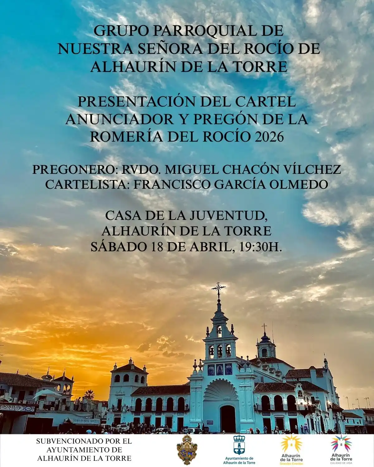 El Grupo Parroquial de Nuestra Señora del Rocío de Alhaurín de la Torre celebrará el próximo sábado 18 de abril, a partir de las 19:30 horas, el acto de presentación del cartel y pregón de la Romería del Rocío 2026, que tendrá lugar en la Casa de la Juventud.