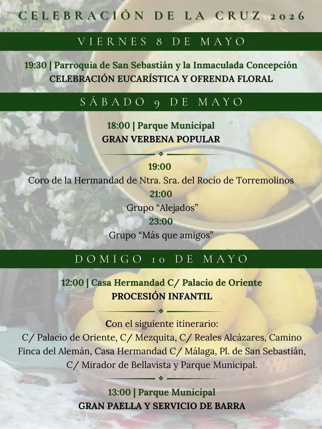 El programa culminará el domingo 10 de mayo con una de las citas más destacadas: la procesión infantil, que dará comienzo a las 12:00 horas desde la Casa Hermandad, recorriendo distintas calles del municipio hasta el Parque Municipal. A continuación, a las 13:00 horas, tendrá lugar una gran paella y servicio de barra para los asistentes.
