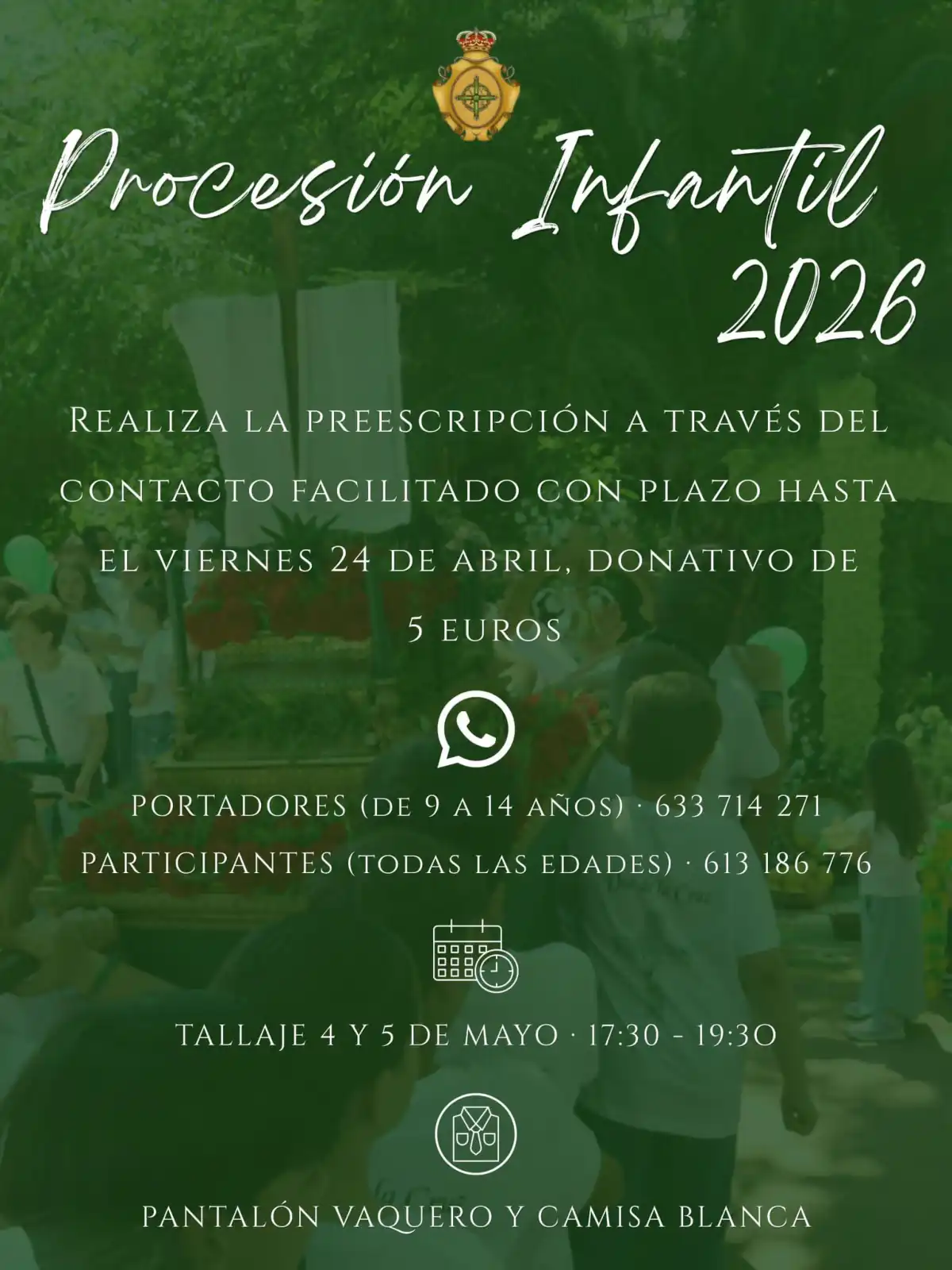 De cara a esta procesión infantil, la cofradía ha abierto el plazo de preinscripción hasta el 24 de abril, con un donativo de 5 euros. Podrán participar niños y niñas como portadores (de 9 a 14 años) y participantes de todas las edades. El tallaje se realizará los días 4 y 5 de mayo en horario de tarde, siendo el atuendo requerido pantalón vaquero y camisa blanca.