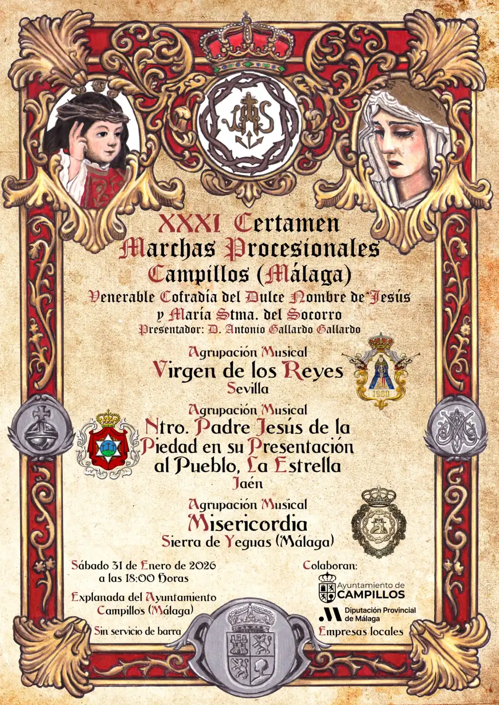 El programa contará con las prestigiosas agrupaciones musicales Virgen de los Reyes de Sevilla y La Estrella de Jaén, y con la joven banda agrupación Misericordia de Yeguas