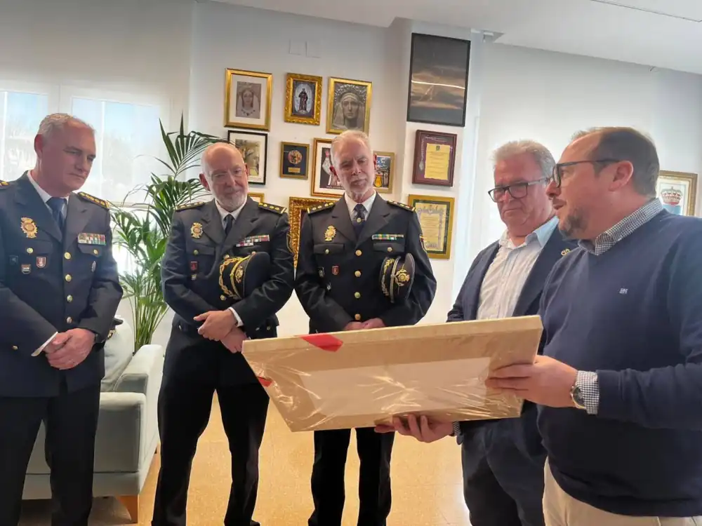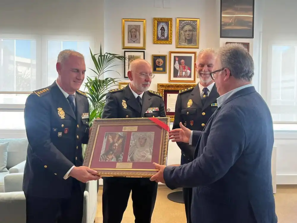 Por su parte, el comisario provincial, Roberto Rodríguez Velasco, también tuvo un gesto con la cofradía, entregando un recuerdo institucional que simboliza la estrecha relación entre la Policía Nacional y la Pollinica.