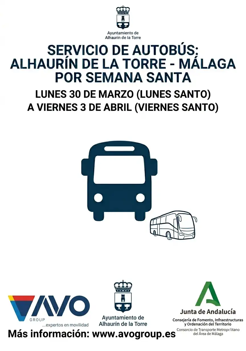Un año más, el Ayuntamiento de Alhaurín de la Torre y el Consorcio de Transporte Metropolitano de Málaga (CTMAN), ponen en marcha un servicio de autobús para visitar la Semana Santa de la capital que funcionará desde el Lunes al Viernes Santo.